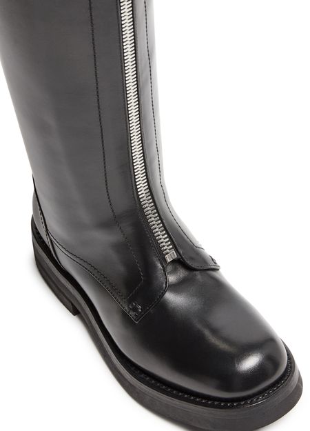 Reveal Alexander McQueen's leather boots, crafted from smooth leather with a low, flat heel and a round, closed toe. The buckled strap and zippered closure offer a secure fit, while visible stitching and a logo on the tongue add signature flair. A thick outer sole ensures comfort and durability.