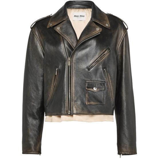 • Description : zipper closure, short, side pockets, zipped breast pocket, flap pockets, long-sleeved, biker jacket.