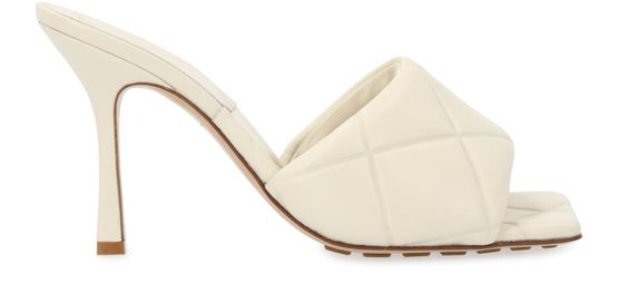 Bottega Veneta's Lido sandals showcase a collection of textures, embodying the fashion house's symbol of luxury and sophistication. The open square toe and contrasting logo add a modern touch, while the very thin sole and stiletto heel exude elegance. These sandals are the perfect blend of style and refinement.