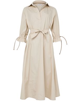 Reveal Max Mara's Belted maxi dress, a refined piece featuring a V-neck and three-quarter sleeves. The tailored collar and belt loops add a sophisticated touch, while the flowing silhouette ensures effortless elegance. Perfect for versatile styling, this skirt transitions seamlessly from day to evening.