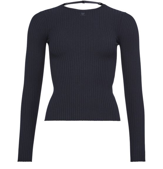 Courrèges's Lingerie strap rib knit sweater showcases a regular length silhouette with a classic crew neck. Its long-sleeved design offers warmth and style, while the embroidered logo adds a touch of elegance. Perfect for layering or wearing solo, this sweater effortlessly combines comfort with chic sophistication for any occasion.