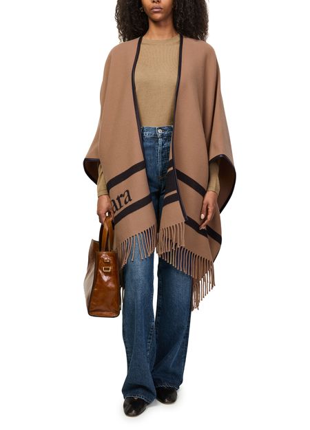 Reveal Max Mara's logo poncho, featuring a printed logo and fringed edges for a refined finish. Contrasting color stripes along the borders add a modern twist, making this accessory a standout addition to any contemporary wardrobe.