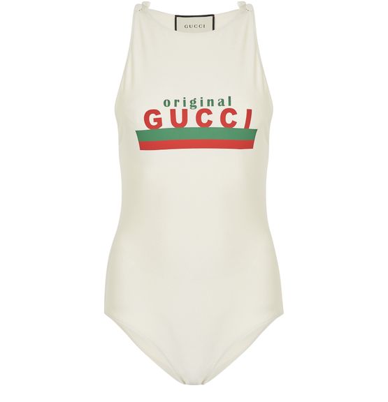 Gucci emphasizes the female figure with this elegant swimsuit with a sportswear look, decorated with the Italian designer's logo.