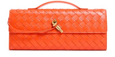 Bottega Veneta's Long Andiamo clutch with handle boasts a sleek design, perfect for hand carrying. Its flap closure secures your essentials, while the interior slots for cards keep you organized. The luxurious gold finish adds a touch of elegance, making it an ideal companion for any sophisticated outing.