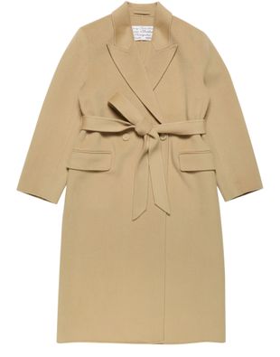 Reveal Acne Studios's long belted coat, a refined silhouette featuring a double-breasted closure and structured collar. Flap pockets and long sleeves add practical elegance, while the tailored belt defines the waist. Crafted for versatility, this coat transitions seamlessly from day to evening with modern sophistication.