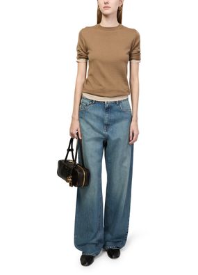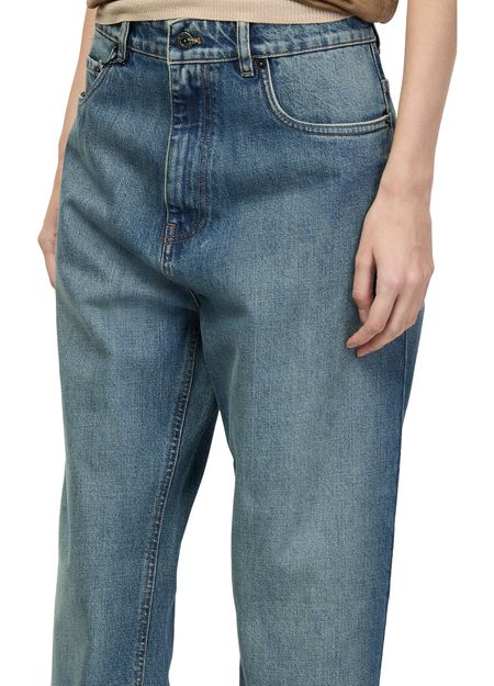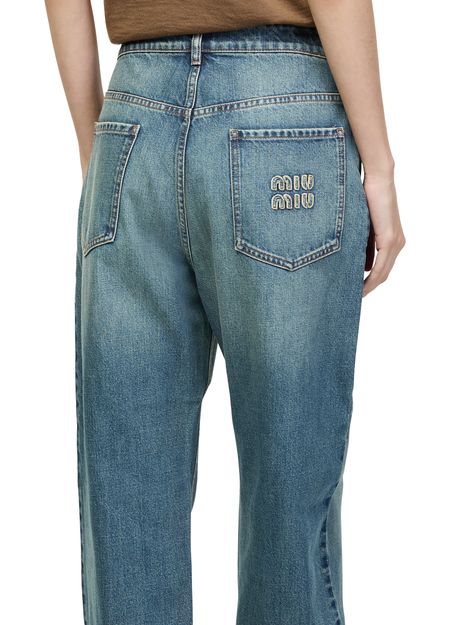 Reveal Miu Miu's low-rise jeans, crafted from premium denim with a sleek ankle length. The buttoned zipper closure, belt loops, and visible stitching add modern flair, while the logo at the back and practical pockets ensure both style and function for versatile, everyday wear.