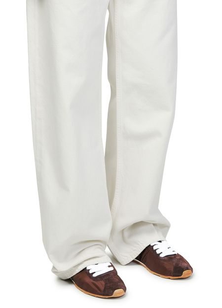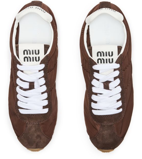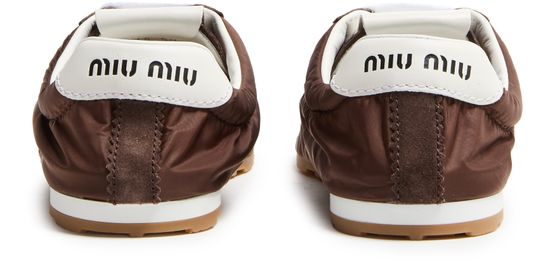 Reveal Miu Miu's low top sneakers, featuring a round closed toe and a low heel for everyday ease. The contrasting sole and visible stitching add a modern edge, while the padded texture ensures comfort. Signature logos on the tongue and back complete this contemporary, standout pair.
