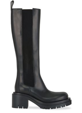 Bottega Veneta's Lug boots are made of smooth vegetable-tanned leather with a round toe and elasticated sides for a comfortable fit. They feature a leather loop at the back for easy slipping on and off, along with a thick, notched sole and block heel for added style and stability. Perfect for any urban adventure.