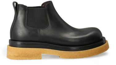 Bottega Veneta's Lug Boots are classic Chelsea ankle boots with elasticated sides for easy slipping on and off. They feature a leather loop at the back for added convenience. The thick outsole provides durability and comfort, while the contrast-color sole adds a modern touch to this timeless design.