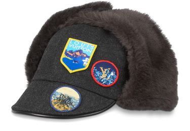 Decorated with vintage-style woven and leather patches, the LV Alpes fur cap captures Louis Vuitton's adventurous spirit. The design is made from soft wool and cashmere. Earflaps, lined with plush shearling, can be worn two ways and feature snap buttons fastened under the chin or on top of the piece.