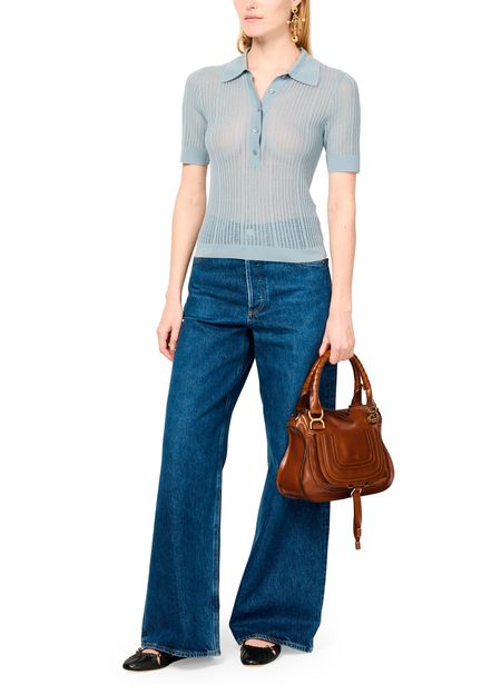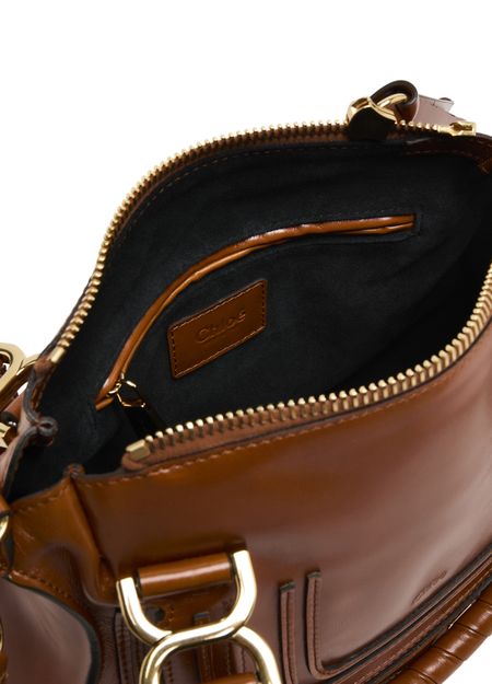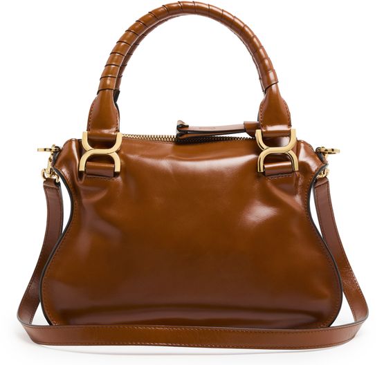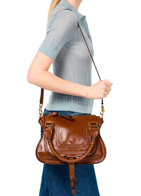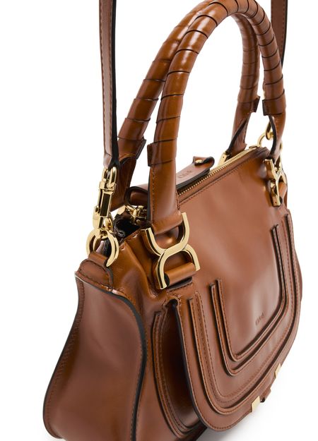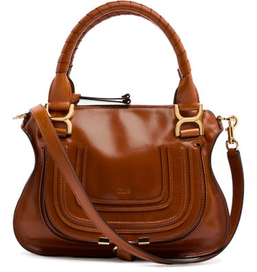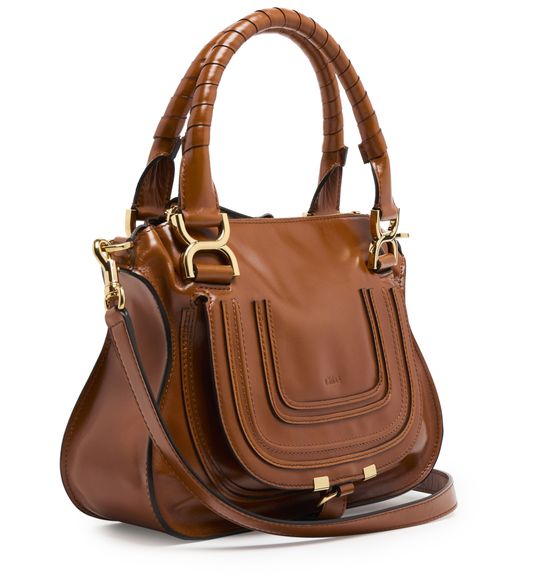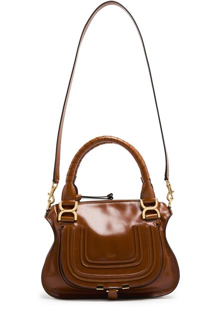 Chloé's Marcie small double worn glossy leather bag visible topstitching and a front logo, exuding elegance. With a zipper closure and single compartment, this mini bag is versatile. Its gold finish complements the double handles and thin strap, allowing it to be hand carried or worn crossbody for effortless style.
