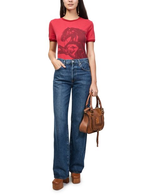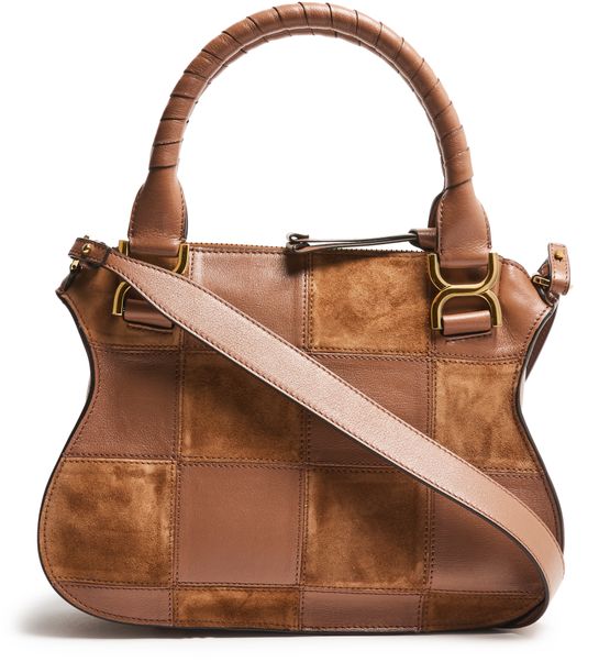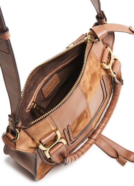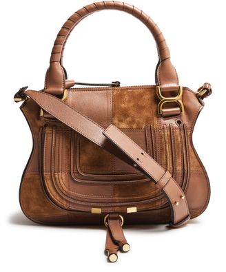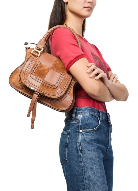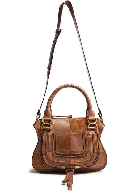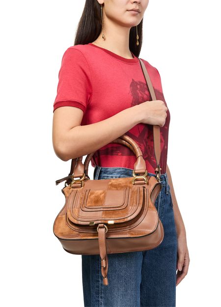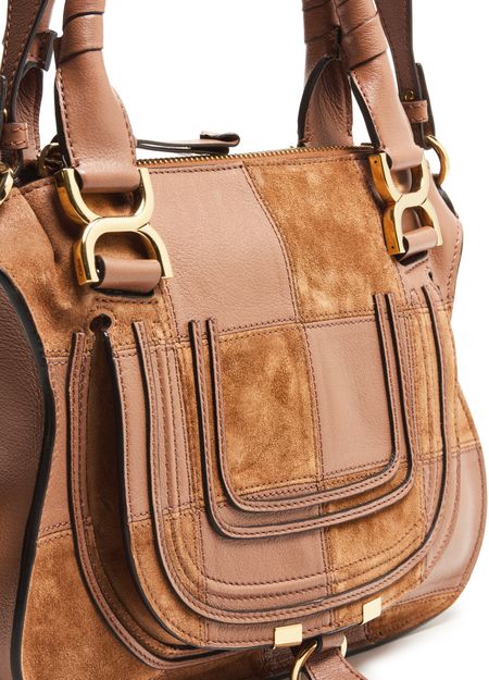 Reveal Chloe's Marcie handbag, crafted in bi-material with signature saddle stitch detailing. The double handles and wide, adjustable strap offer versatile carrying options, while the zippered interior pocket and gold finish add refined functionality to this modern shoulder and crossbody bag.