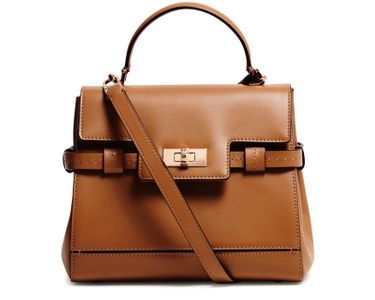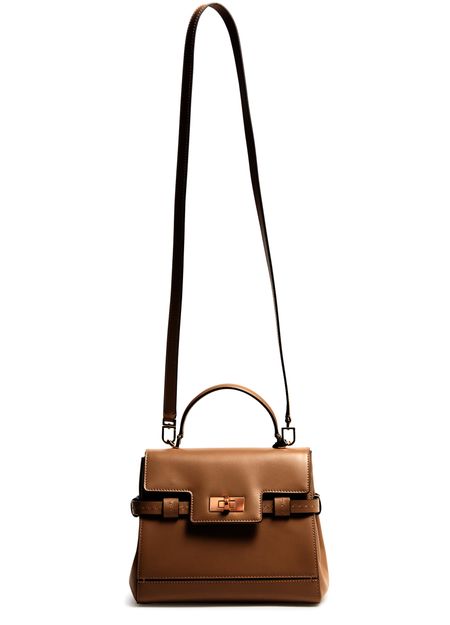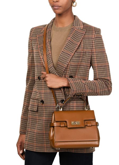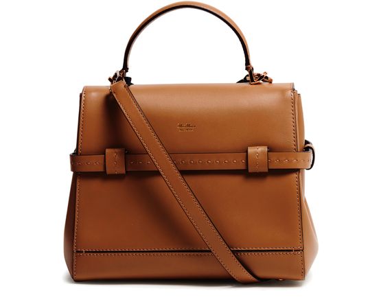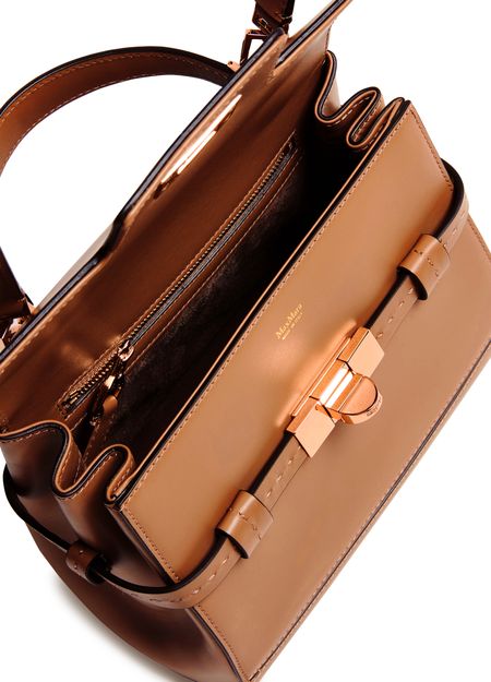 Reveal Max Mara's Margaux handbag, a masterpiece of modern design. Crafted from smooth leather, this shoulder bag features a single handle and a detachable thin strap for versatile wear. The twist lock closure secures a spacious interior with a zippered pocket, all adorned with a front logo and gold finish.