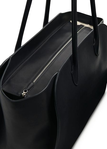 Reveal The Row's Marlo tote bag. This elegant shopper features a zippered interior pocket and visible topstitching. Designed for versatility, it can be hand carried or worn on the shoulder with its thin strap and double handles. The engraved logo and silver finish add a sophisticated touch.