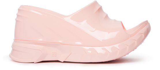 Givenchy'sMarshmallow rubber wedge sandals feature an open round toe design with a sleek and modern aesthetic. The embossed logo on the side adds a subtle touch of branding, while the logo at the back provides a signature finish. With a wedge heel, these sandals offer a stylish and comfortable option for any outfit.