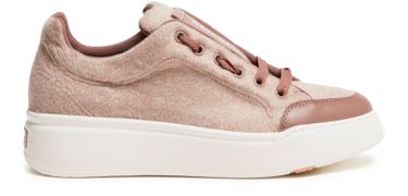 Reveal Max Mara's Maxi sneakers, crafted from warm fabric with a platform heel and round toe. The closed design features laces and a strap, complemented by a thick outer sole. Visible stitching and logos on the tongue and back add a touch of sophistication.