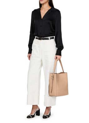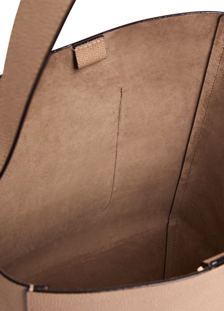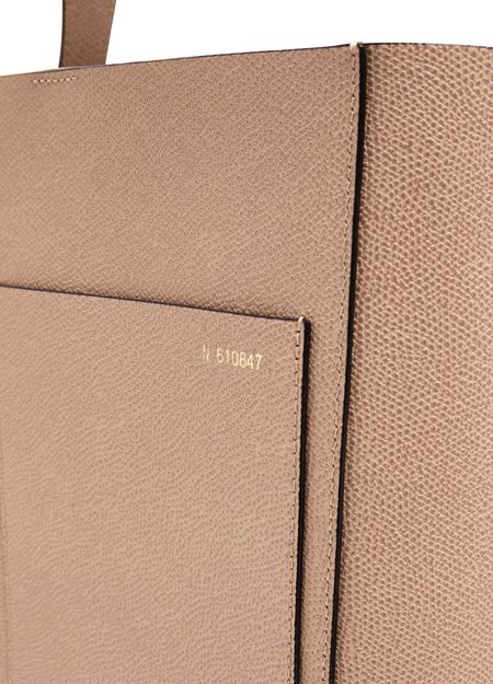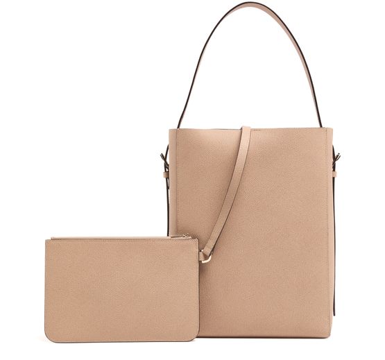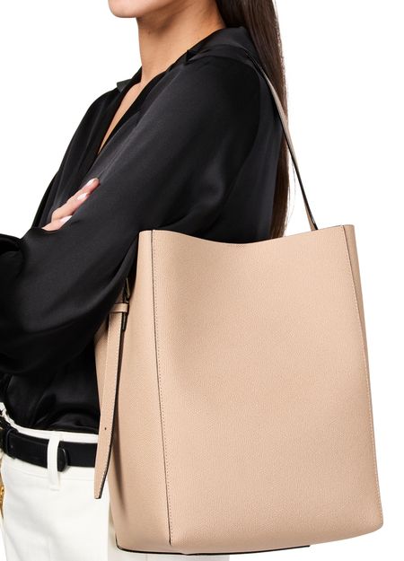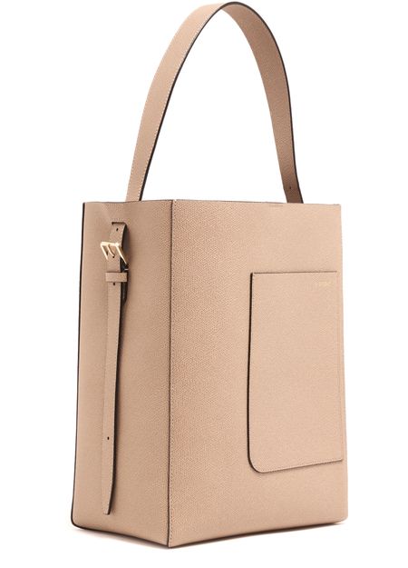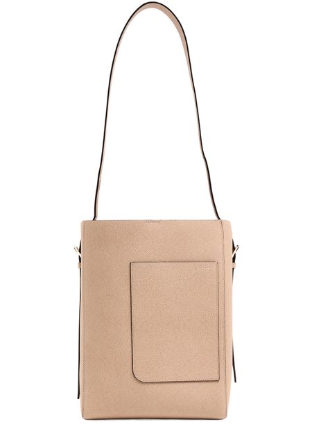 Reveal Valextra's medium bucket bag. Crafted with a gold finish, this bag features a single handle, front logo in gold letters, visible topstitching, and an adjustable strap. Designed for crossbody or shoulder wear, it offers a sleek, modern look with its thin strap.