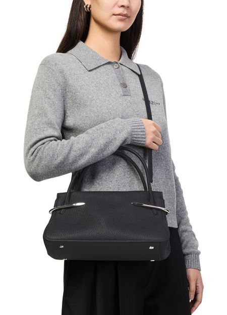 Reveal Givenchy's Medium Pinch bag in grained leather, crafted with double handles and a thin strap for versatile wear. The visible stitching and silver finish highlight its refined design, while a spacious interior compartment ensures practicality. This piece seamlessly blends modern sophistication with everyday functionality.