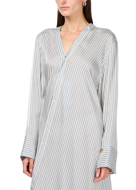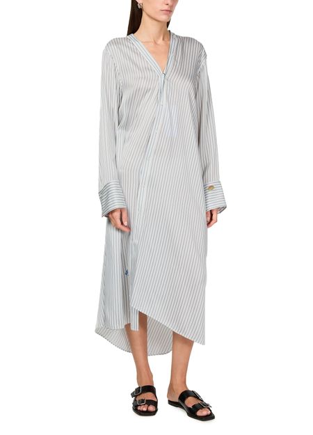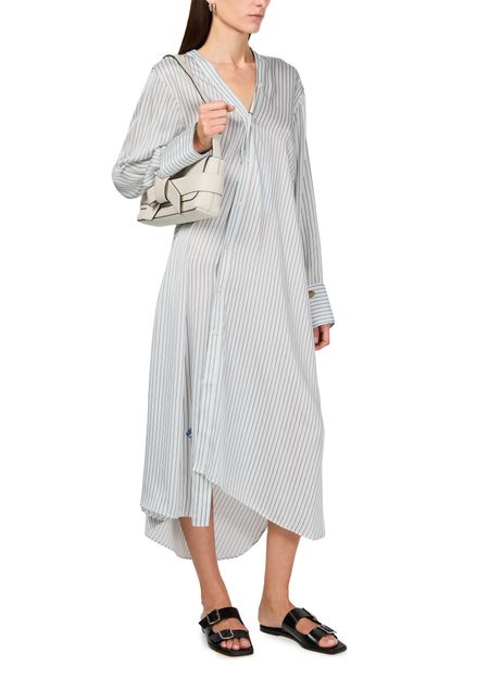 Unveil the Acne Studios Asymmetrical shirt dress, a loose fit shirt dress that redefines elegance with its striped print and asymmetric cut. The V-neck and long cuffed sleeves enhance its modern silhouette, while the button fastening ensures a sleek finish. Perfect for versatile styling, from casual days to upscale evenings.