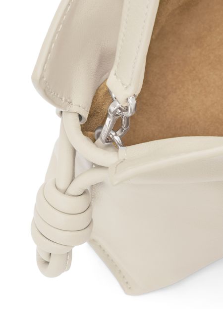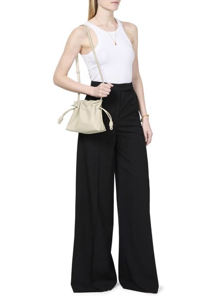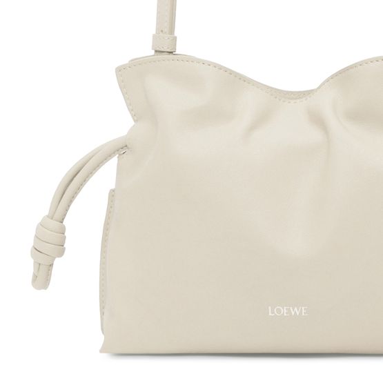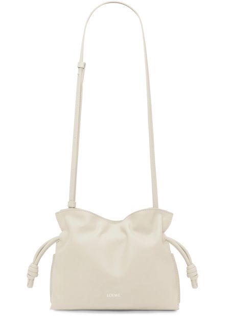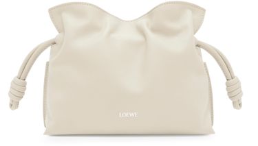 Loewe's Mini Flamenco clutch features a front logo in silver letters and a drawstring closure. It can be hand carried with its thin strap or worn on the shoulder or crossbody with the detachable strap. This versatile bag is perfect for adding a touch of elegance to any outfit.