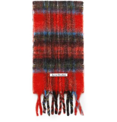 Reveal Acne Studios's checked wool scarf, a statement piece with fringed edges and a front logo. The soft texture and modern pattern make it a versatile accessory, perfect for elevating any look with a touch of contemporary flair.