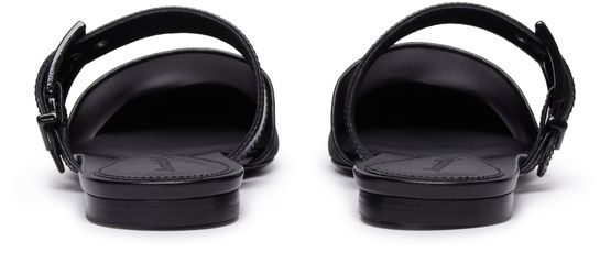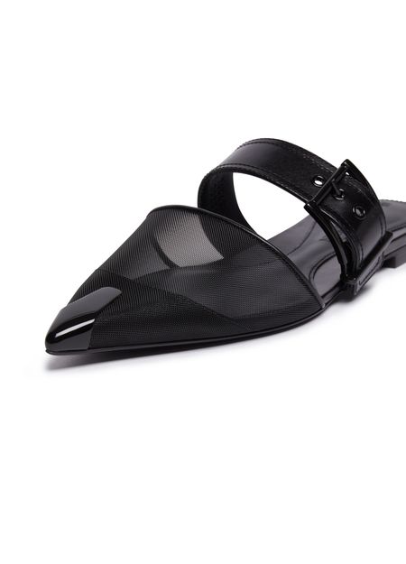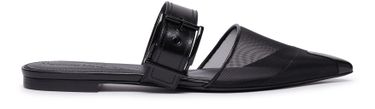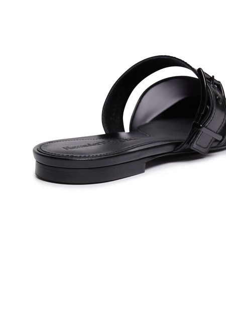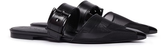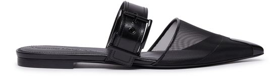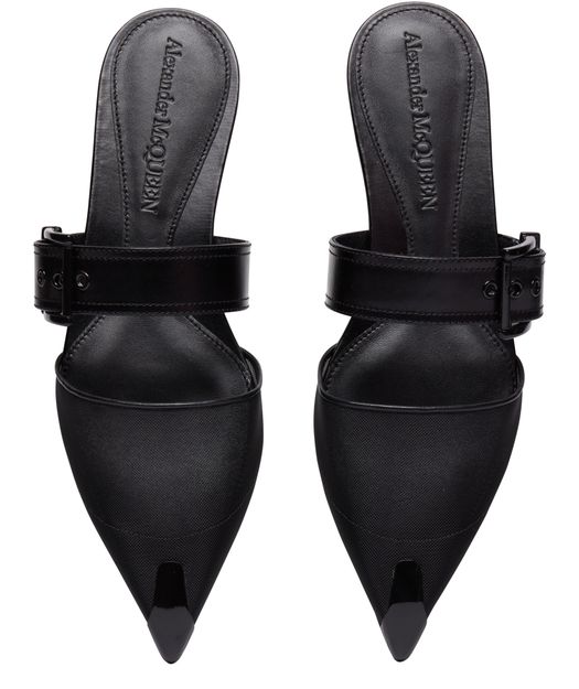 Alexander McQueen's mules feature a bi-material design with smooth leather and a pointed toe for a sleek shape. They are adorned with a buckled strap and have a very thin sole with a flat heel for a modern look. Perfect for adding a touch of sophistication to any outfit.