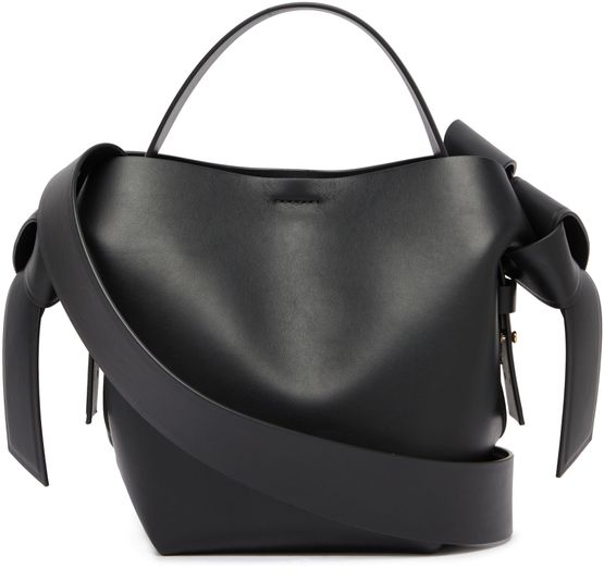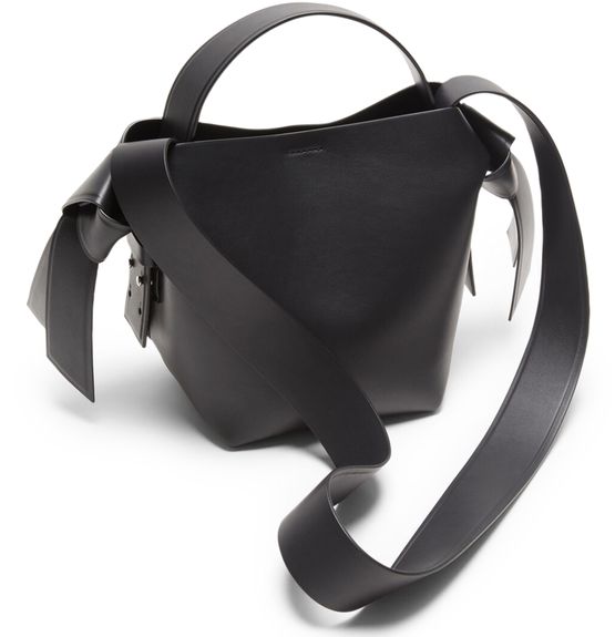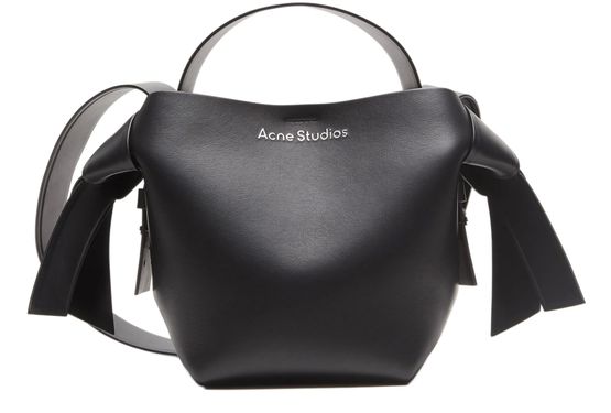 Acne's Musubi mini shoulder bag features a single compartment and a wide strap for wearing on the shoulder. The printed logo on the front is accented by silver lettering for a sleek, modern look. The silver finish adds a touch of sophistication to this stylish and versatile accessory.