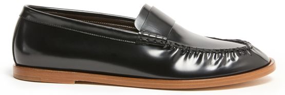 Reveal The Row's new mens leather loafers, crafted from smooth leather with a refined round toe and closed design. The flat heel ensures comfort, while visible stitching and a printed logo add a signature touch. These loafers offer a sleek, modern finish for any wardrobe.