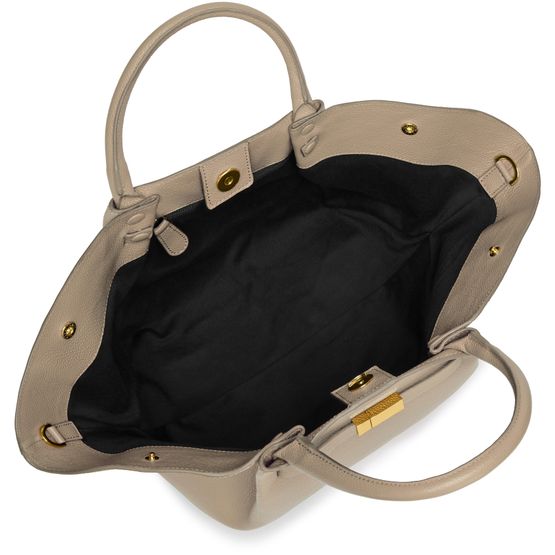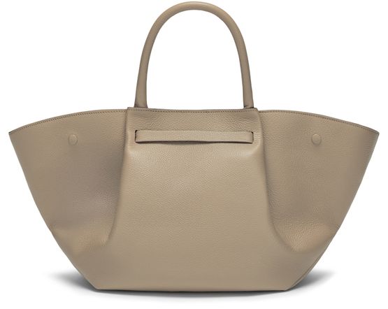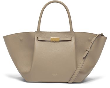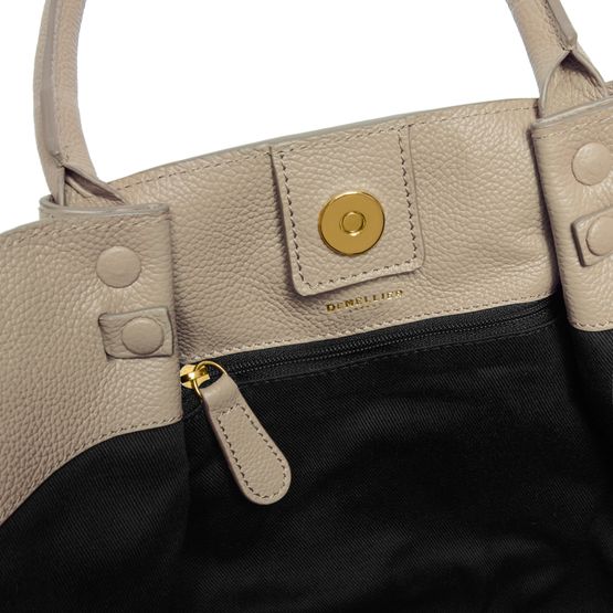 Reveal Demellier's The Midi New York handbag, crafted from grained leather with double handles and a thin, adjustable strap for versatile wear. The front logo, visible stitching, and silver finish add refined detail, while spacious compartments and secure snap-button fastening ensure both style and practicality.