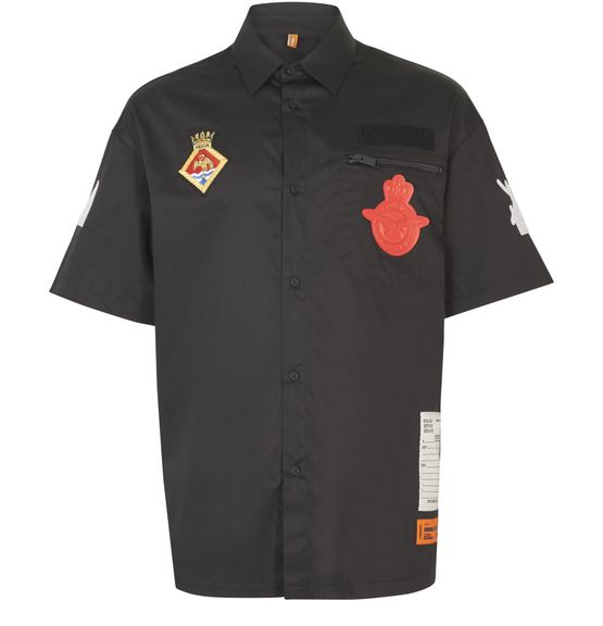 Inspired by workwear, this Heron Preston shirt, a runway piece, retains a traditional structure while the multitude of colorful patches adds unique style.