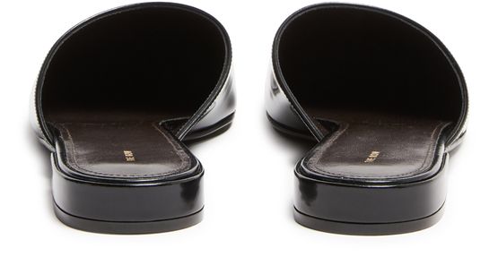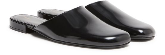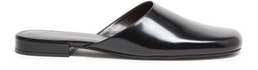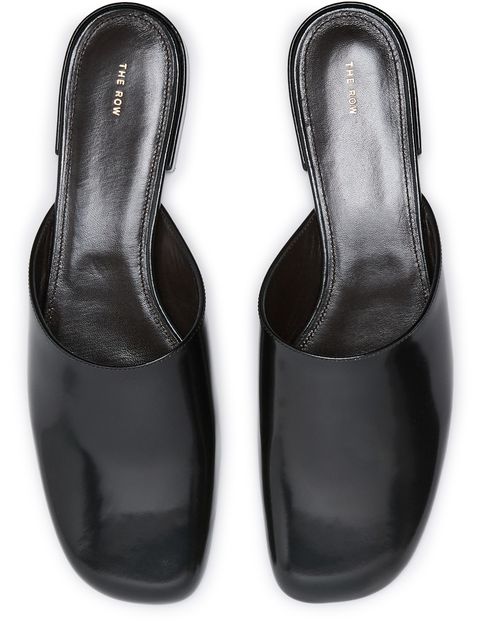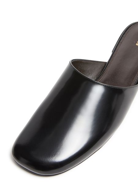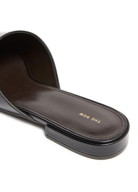 Reveal The Row's Penelope mules in leather, crafted from sleek patent leather with a refined closed square toe. The low, flat heel and very thin leather sole offer understated sophistication, while the printed logo adds a subtle signature touch. Experience modern comfort and style in every step.