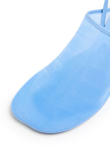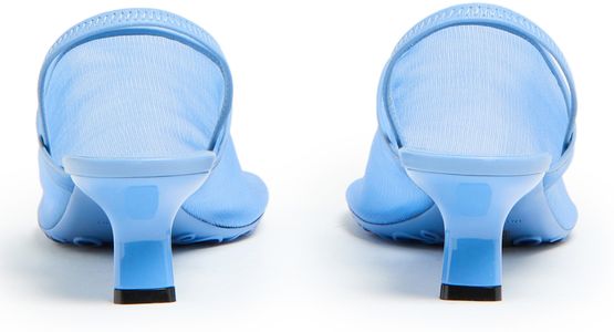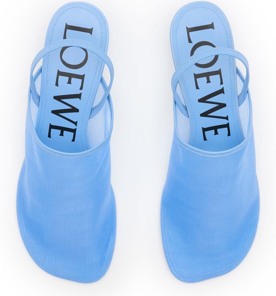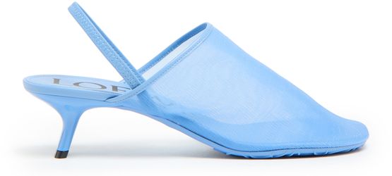 Loewe's Petal mesh sling-back mule 45 is a closed round toe pump with a medium stiletto heel. It features visible stitching, a rear strap, and a logo-printed insole for added style.
