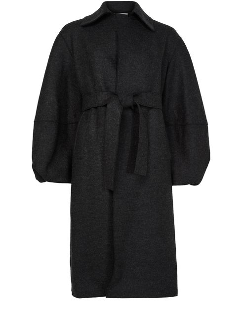 Introducing Harris Wharf London's puff-sleeved coat in pressed wool, a sophisticated knee-length design featuring a classic collar, long sleeves, and convenient side pockets.