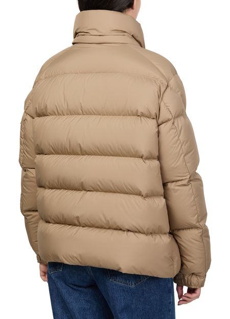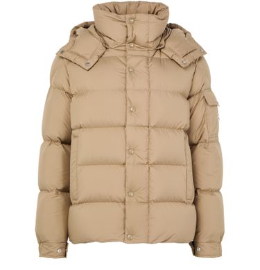 Introducing Moncler's Maya 70 puffer jacket, a short, long-sleeved masterpiece with a high neck and button fastening. Its padded texture and side pockets offer both style and practicality. The logo on the side adds a distinctive touch, making it perfect for any occasion.