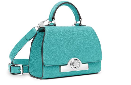 • Description : Mini bag, adjustable, detachable strap, leather handle, flap closure, engraved metallic logo clasp, metal with a silver finish, hand carried, worn on the shoulder or crossbody.