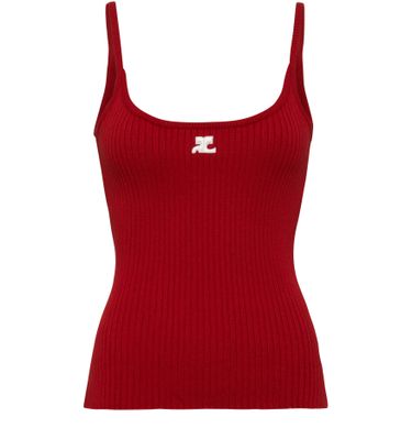 Courrèges's Rib knit tank top showcases a sleeveless design with a spaghetti strap neckline, perfect for warm days. Its thin shoulder straps enhance the slim fitting silhouette, while the front logo adds a touch of brand elegance. Effortlessly chic, this top is a versatile staple for any wardrobe.