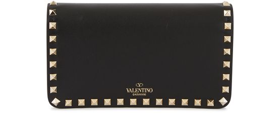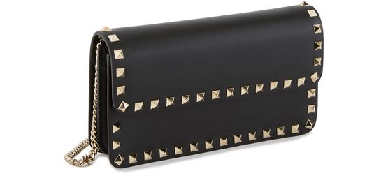 This Italian fashion delivers an elegantly rebellious accessory with this Valentino Garavani Rockstud clutch. This iconic rectangular flap piece is offered in a timeless black grained leather. The signature pyramid-shaped studs illuminate its contours, echoing the long gold chain that allows you to wear across your body or over your shoulder.