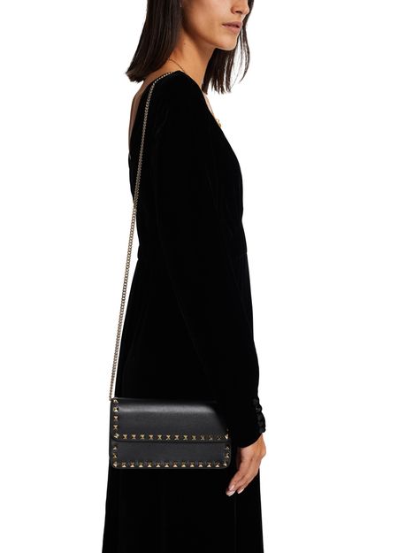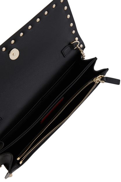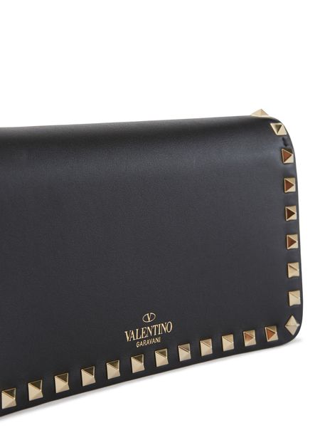 • Details : Valentino Garavani Rockstud chain clutch in calfskinNails and parts in platinum finish metalMagnetic button claspZipped front pocket under the flapTwo compartments separated by a flat pocket and eight card slots Length of the chain: 57 cm