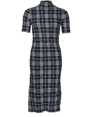 Unveil the Burberry Checked Midi Dress, a sublime blend of timeless elegance and modern flair. This slim-fit creation, with its mockneck and ruffled sleeves, showcases a checked pattern that captivates. Its midi length and intricate design make it ideal for a variety of occasions.