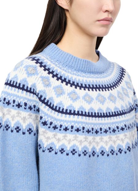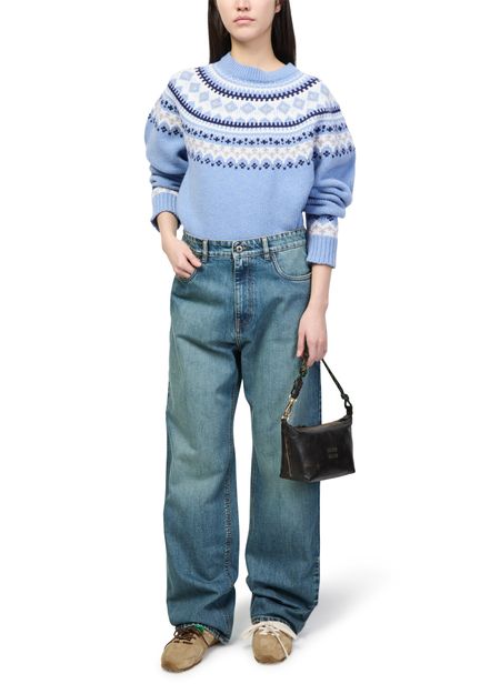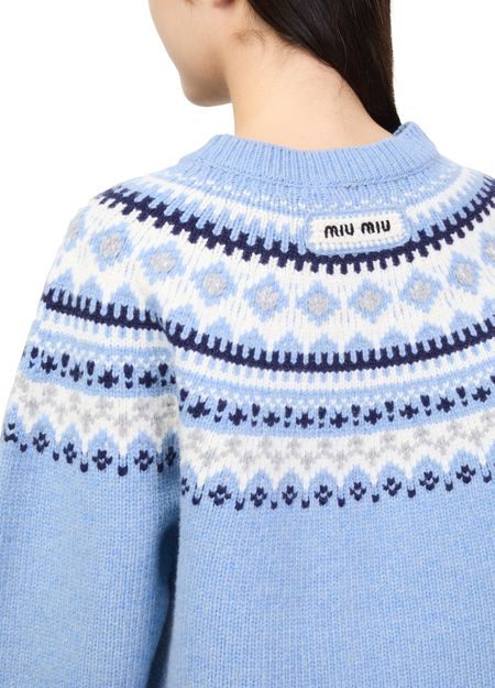 Reveal Miu Miu's round neck mountain sweater, crafted in a long silhouette with ribbed texture and geometric diamond patterns. The logo at the back adds a signature touch, while long sleeves and a versatile design make it perfect for layering or standalone style.