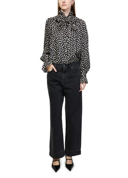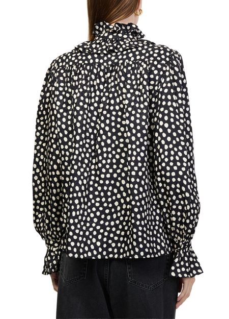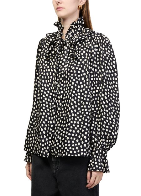 Reveal Chloe's polka dot blouse, featuring a high-neck and ruffled long sleeves for a refined silhouette. The playful polka dot pattern adds a lively touch, while the elegant design ensures effortless pairing with tailored pants or skirts for both day and evening occasions.