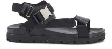 These sandals are by Prada. These flat shoes have a sleek monochrome design. Wide straps are fastened with a clip.