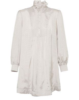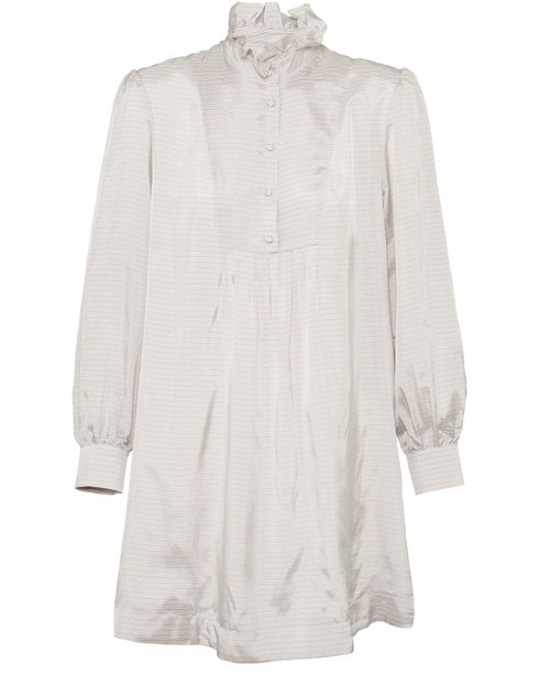 Designer Alexa Chung presents a striped dress featuring a buttoned shirt-style bustier and Pierrot collar. Cuffs tighten the sleeves at the wrists.