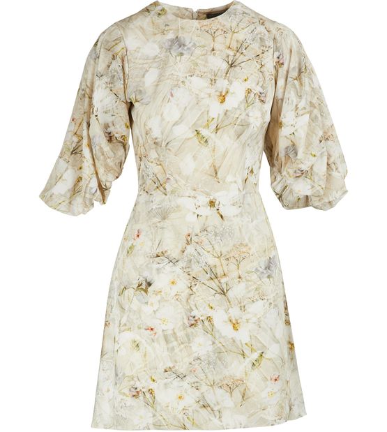 This silk mini dress by Alexander McQueen embodies a strong and delicate vision of femininity. The lightweight floral fabric is enhanced with symmetry and puffed sleeves. Go for the runway's bold style by using a black belt to play with contrasts and highlight your waist.