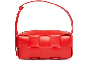 Crafted from smooth leather, Bottega Veneta's Small Brick Cassette bag features an adjustable handle and signature Intrecciato weaving. It is designed with a zipper closure, single compartment, and interior patch pockets. The bag also boasts an embossed logo and can be worn in the hand or on the shoulder for versatile styling.
