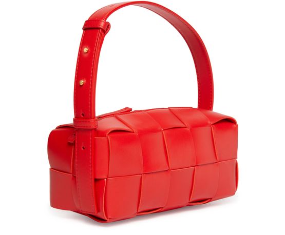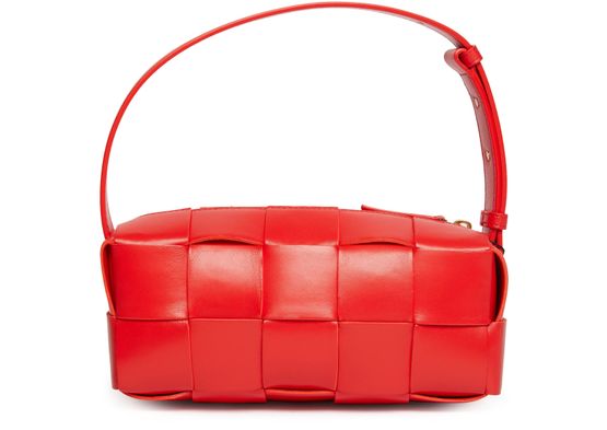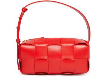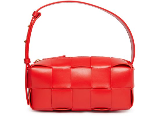 Crafted from smooth leather, Bottega Veneta's Small Brick Cassette bag features an adjustable handle and signature Intrecciato weaving. It is designed with a zipper closure, single compartment, and interior patch pockets. The bag also boasts an embossed logo and can be worn in the hand or on the shoulder for versatile styling.