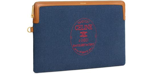 Discover the small pouch with strap in textile with embroidery, wrist pouch by Celine with its elegant design featuring a main compartment and a removable wrist strap.