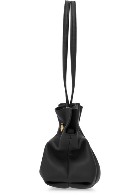 Reveal Salvatore Ferragamo's soft handbag, crafted from smooth leather with a refined gold finish. The adjustable, detachable thin strap and double handles offer versatile carrying options, while the drawstring closure and front logo in gold letters add a signature touch to its spacious, thoughtfully designed interior.
