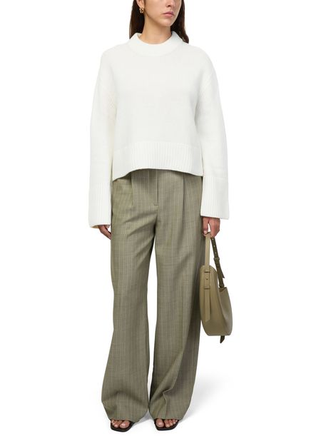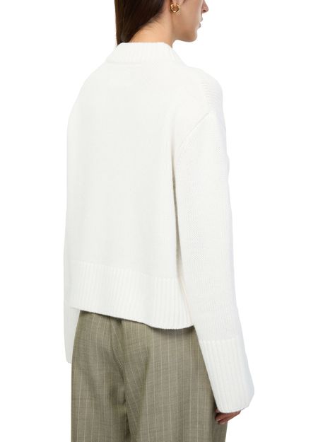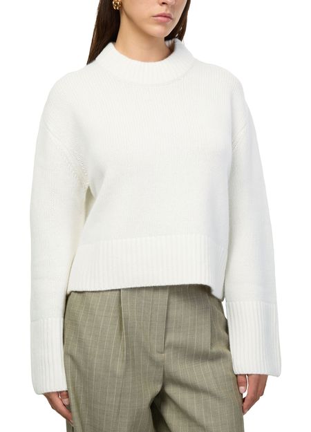 Reveal Lisa Yang's cashmere round-neck sweater, a cropped knitwear piece with a ribbed texture and dropped long sleeves. The round neckline and relaxed fit offer effortless sophistication, making it a versatile choice for layering or standalone styling across seasons.