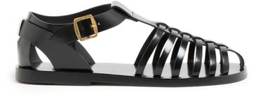 • Description : sandals & slides, wide buckled strap, visible stitching, gold finish, round toe, closed.